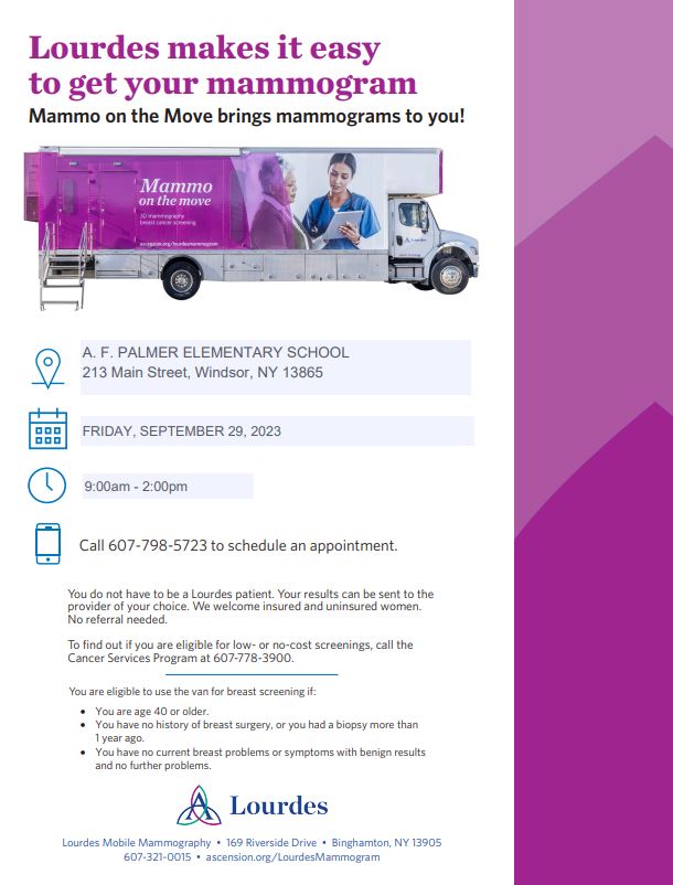 The Lourdes Mammo on the Move van will be at Palmer Elementary on Friday, September 29th from 9am-2pm.