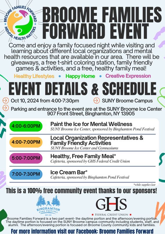 Local families are invited to the Broome Families Forward event at the SUNY Broome Ice Center on Thursday, October 10th from 4:00-7:30pm. You can learn about local organizations and mental health resources. You can also enjoy free giveaways, a t-shirt coloring station, family-friendly games and activities, a free meal, and ice cream bar.