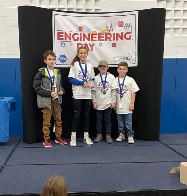 The Palmer Elementary team of Olivia Hans, Owen Knapp, Carson Terrell, and Chase Whitehead had to make a Rube Goldberg machine to knock down two pins. They ended up making one that knocked out the competition at the Broome-Tioga BOCES Engineering Day.