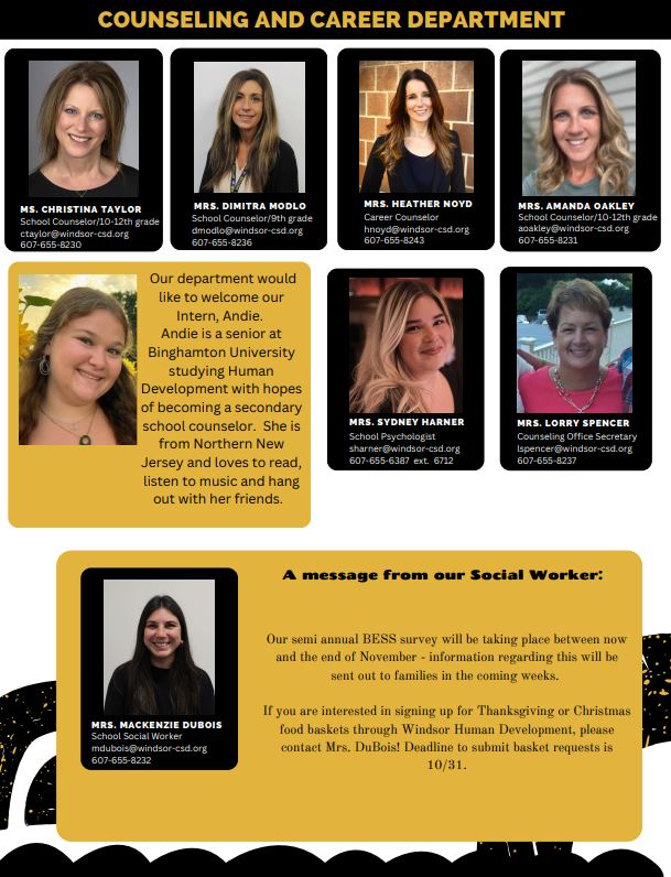 The school counselor will play an integral role in the planning of each student’s high school program. Every student will be assigned a counselor for the duration of their high school years. Counselors will be available by appointment to discuss class schedules, career options, college plans and personal issues as needed.