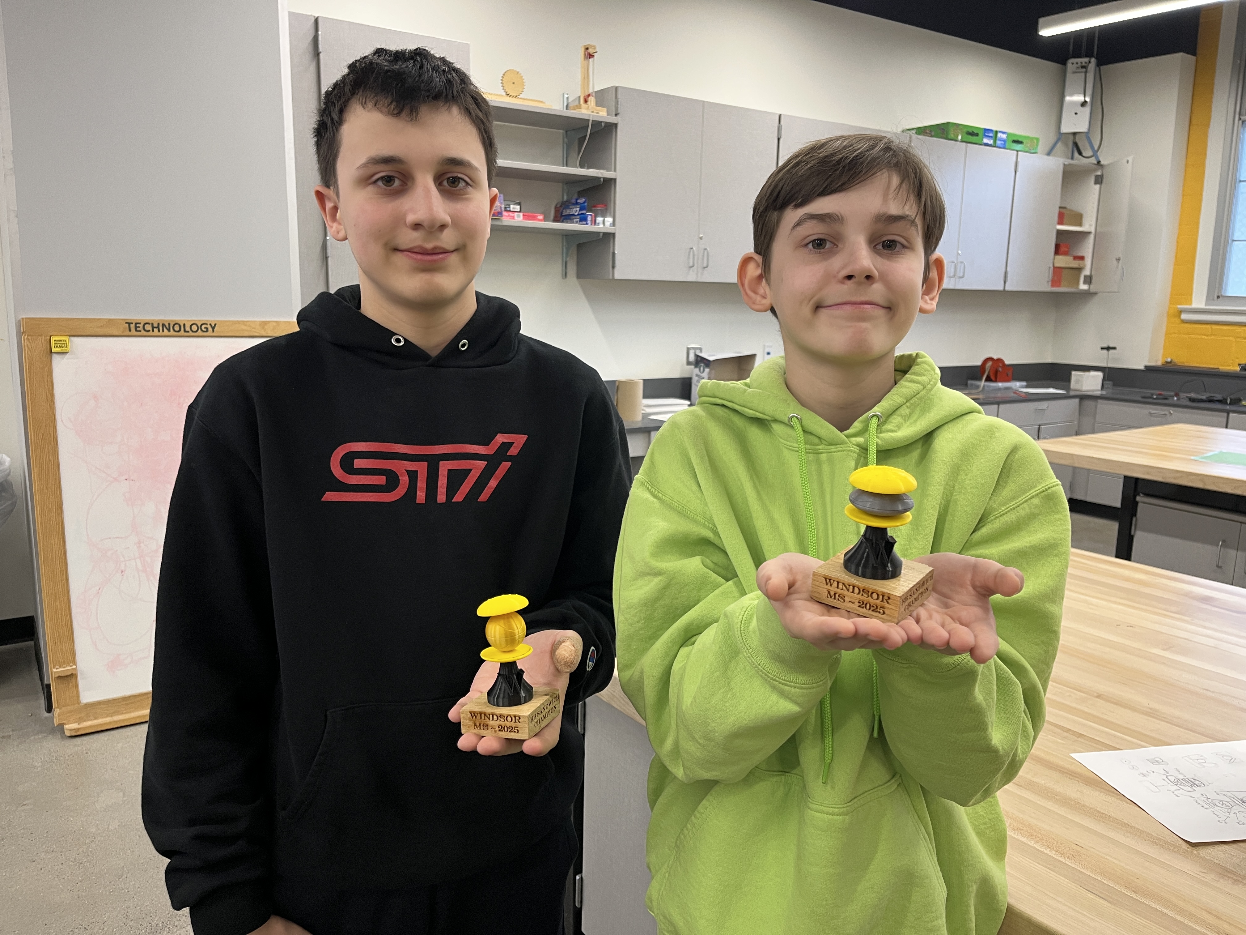“We laser-engraved lines into the wood and the writing on the side. We 3D printed the balls, laser cut the pins and water bottle pin,” said 8th grader Lucas Sansom, who helped create the bowling trophies.