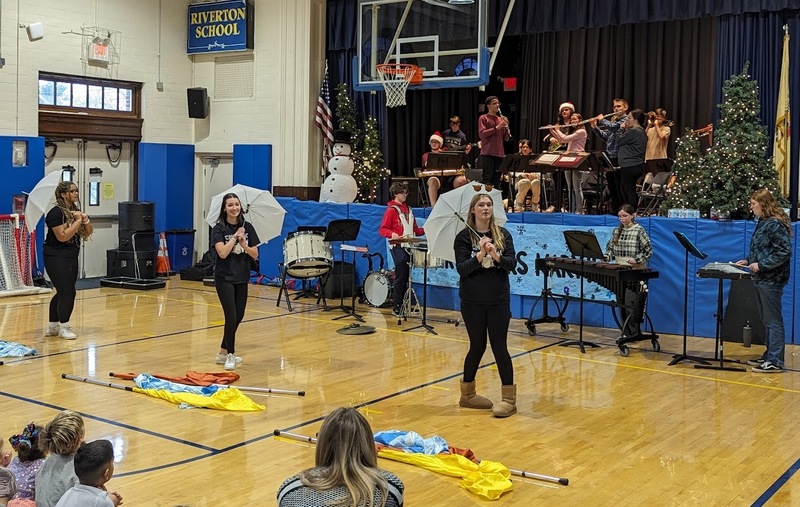 This week, Riverton School's PreK-8 students enjoyed a sampling of the musical talents from Palmyra High School Band! Mr. Moore's concert band and award-winning Palmyra Marching Band & Color Guard members visited Riverton School sampling holiday music, football fight songs, and color guard routines.