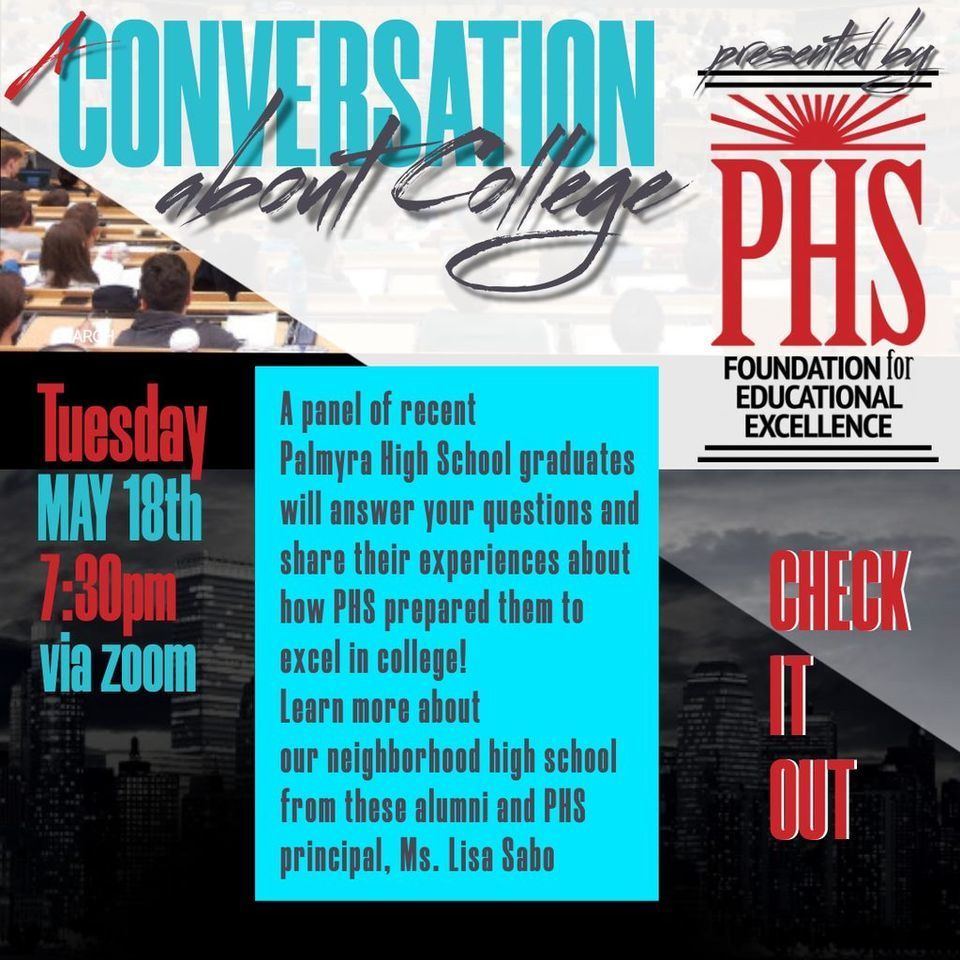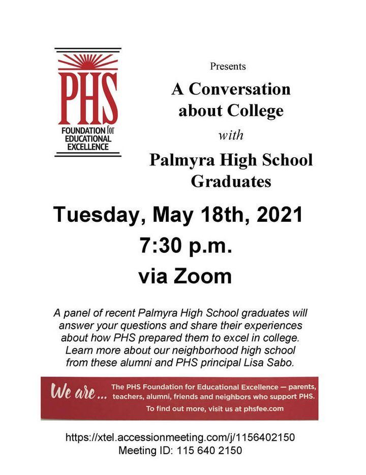 A reminder that PHSFEE is sponsoring a panel on the PHS experience with panelists made up of recent grads sharing their college experience and how PHS prepared them for the next step in their education. A link to the PHSFEE page with access information is here.