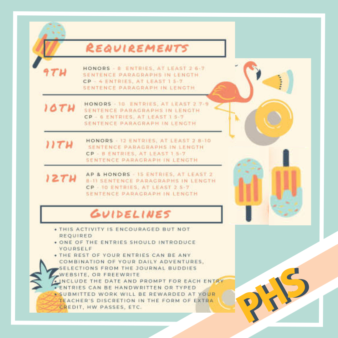 FRESHMEN | Sophomores | Juniors | SENIORS: Your English Teachers have outlined the requirements for this summer writing activity. Find your Journal prompts at JournalBuddies.com.