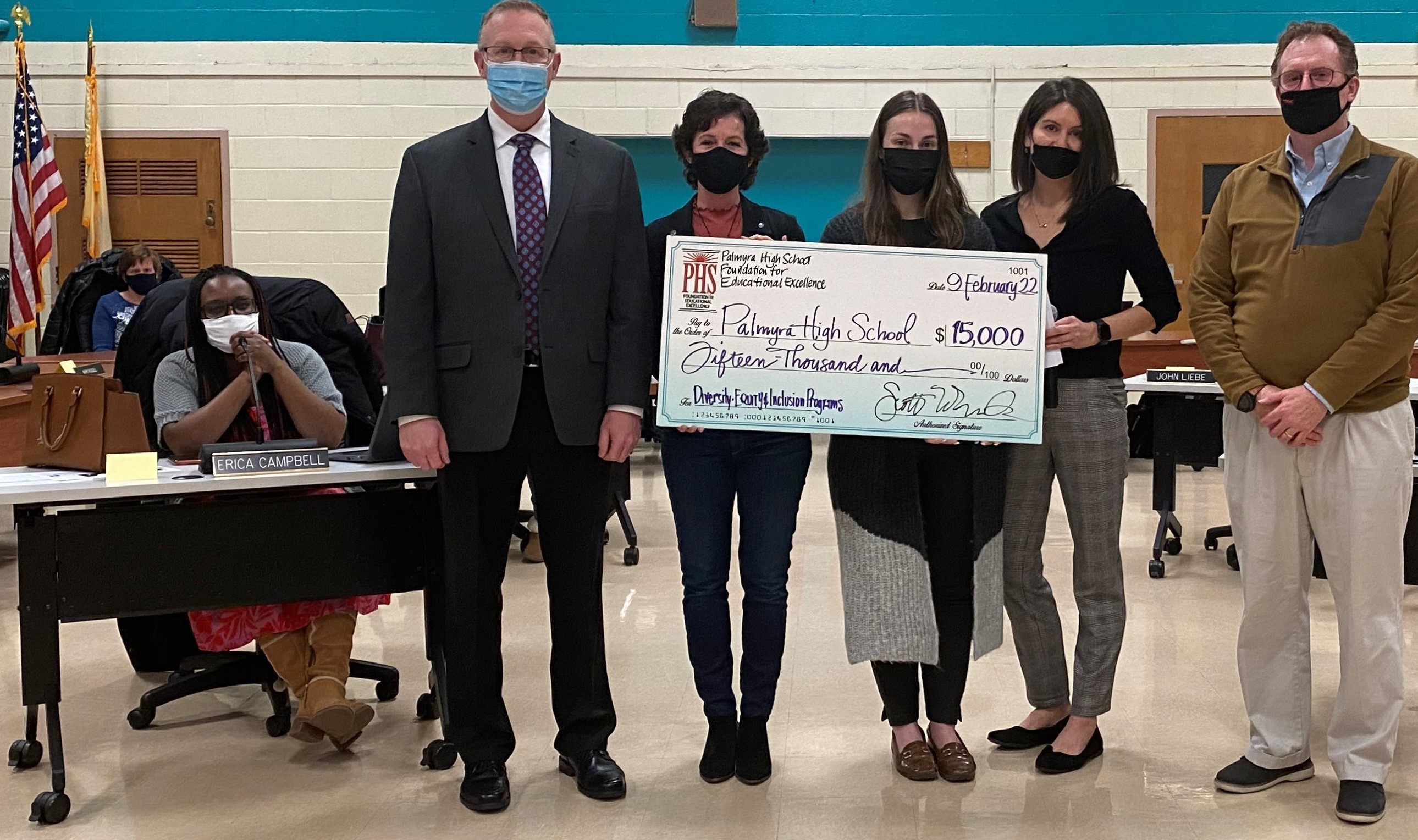 Three trustees: Vanessa Livingstone- PHS alum 2016, Sonya Litwack-Hart-parent, and Jody Demas-alumni parent, presented a check for Fifteen Thousand Dollars to the High School at the February Board of Education meeting to Dr. Brian McBride-superintendent and Mr. Sean Toner-Board President. The funds are the result of this past year's fundraising efforts that included a Color Run at Charles Street School and because of COVID precautions, a Casi-NO Raffle.