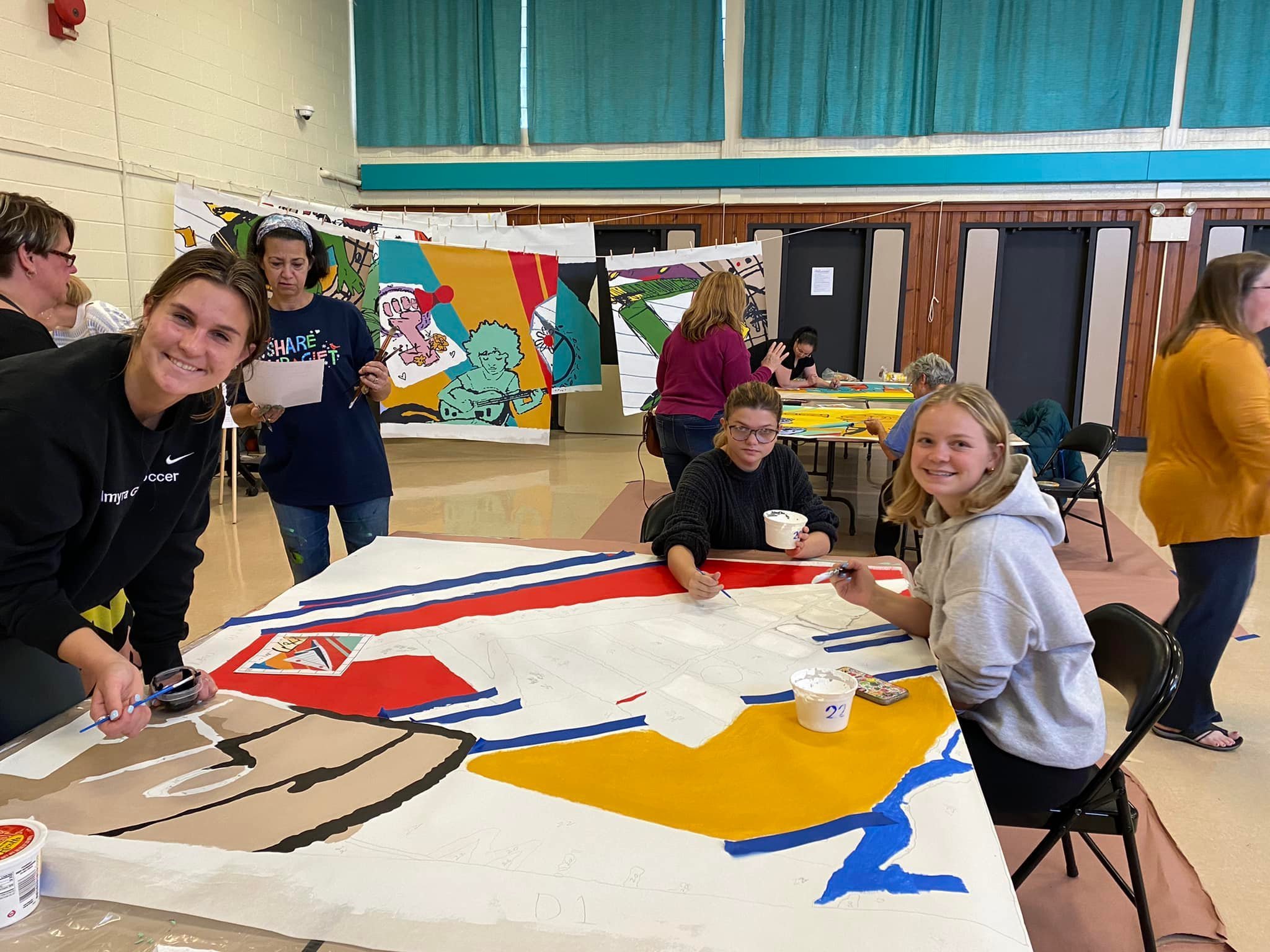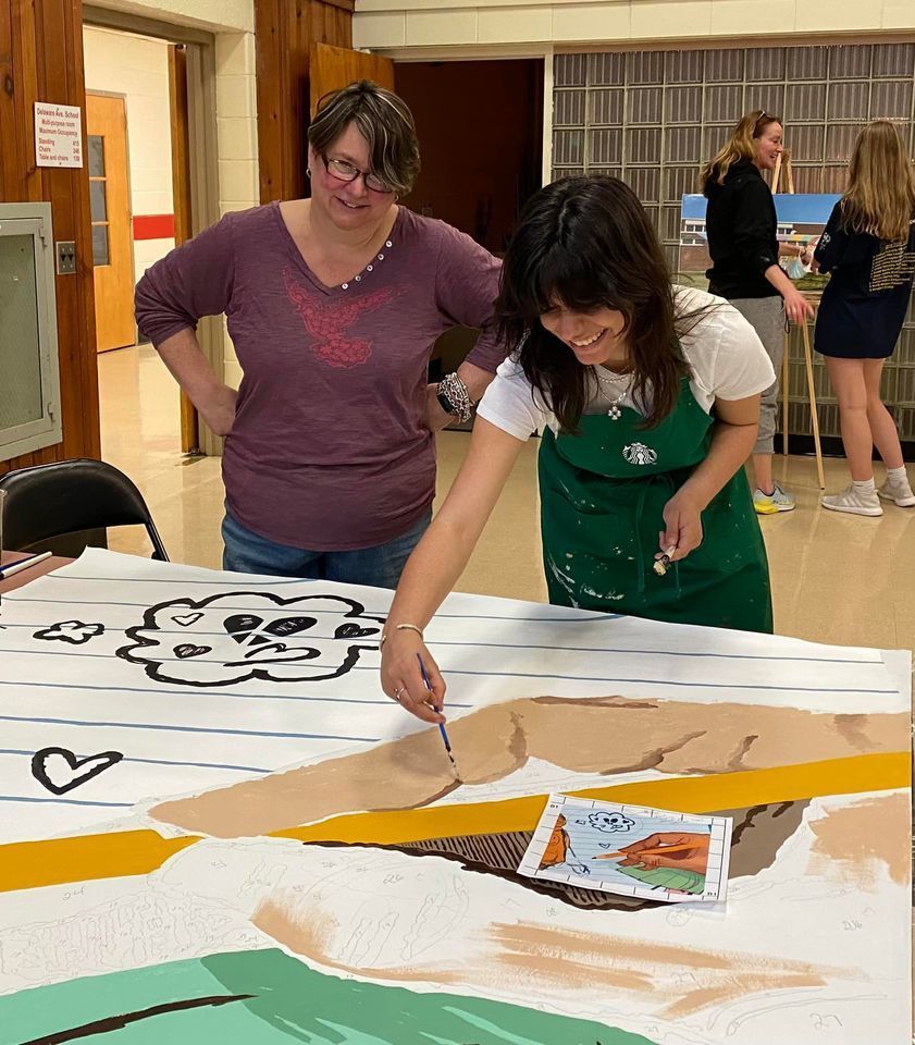 A gift from the Palmyra High School Foundation for Educational Excellence (PHSFEE) to the Palmyra High School that had over 100 different people putting time into the painting of the panels- many were students from the high school art classes and Art Club. We also had parents, alumni, teachers, Board Members, and even Dr. McBride put some effort into the painting of this 40+ foot long work of art designed by 2019 PHS Grad, Daphne Philippoussis.