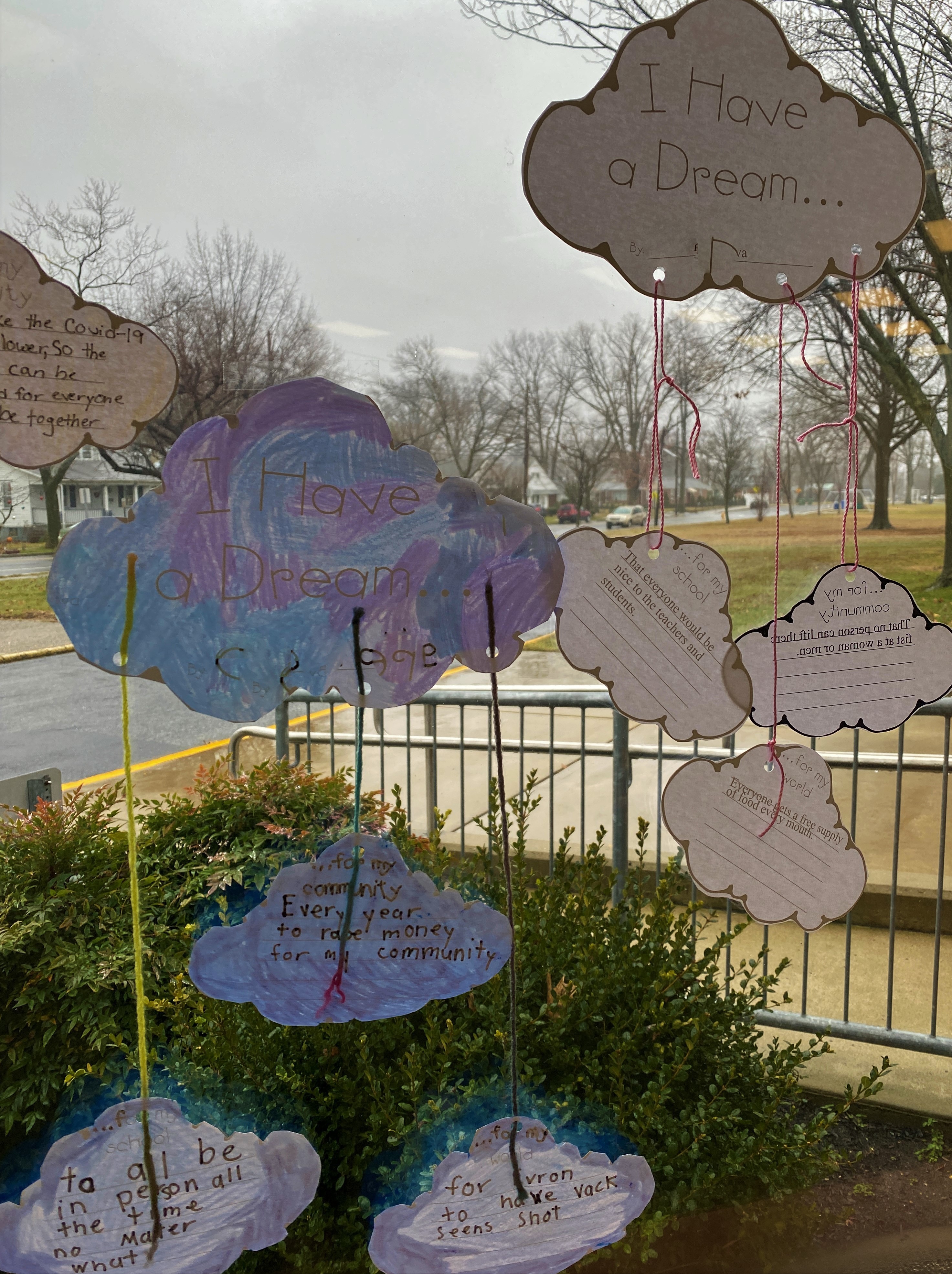 Students were encouraged to share their own dreams, they were provided with a template & string to launch their ideas into the clouds.  The result: magical.  Students from all CSS grades, many of whom are 100% remote, shared their thoughts & dreams to be displayed in the windows of the building.