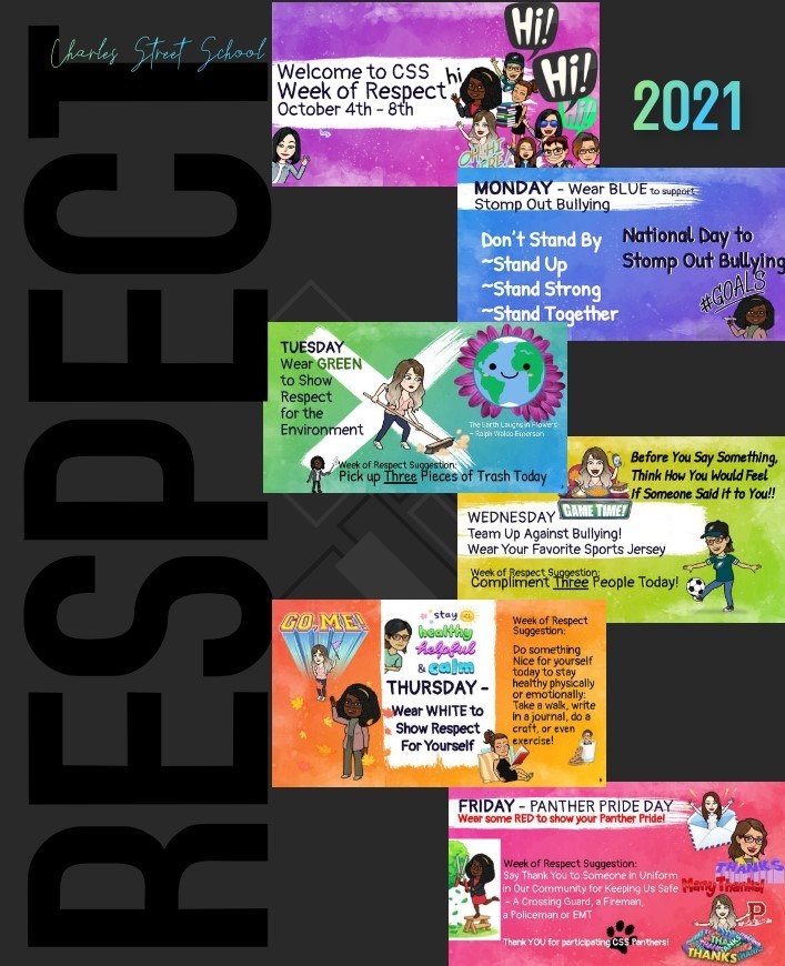 All throughout the halls and classrooms of Charles Street School next week, RESPECT will be the focus. CSS has always held their Week of Respect in October and the tradition continues this year. Mrs. Lee is looking forward to seeing all of these amazing acts of RESPECT.