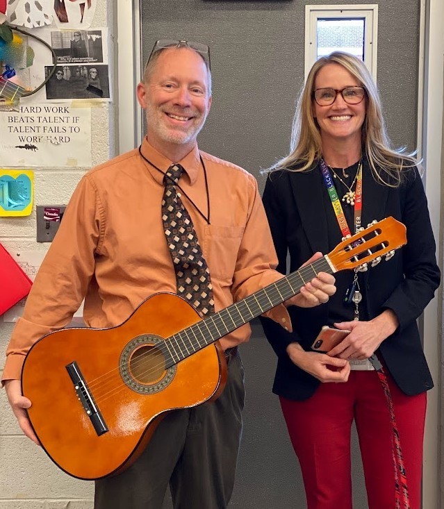 Ms. Sabo, PHS Principal, surprised Palmyra's Band Director, Mr. Jeffrey Moore who was more than happy to accept 6 shiny new acoustic & 2 even shinier electric guitars for use in his classes!!![]()