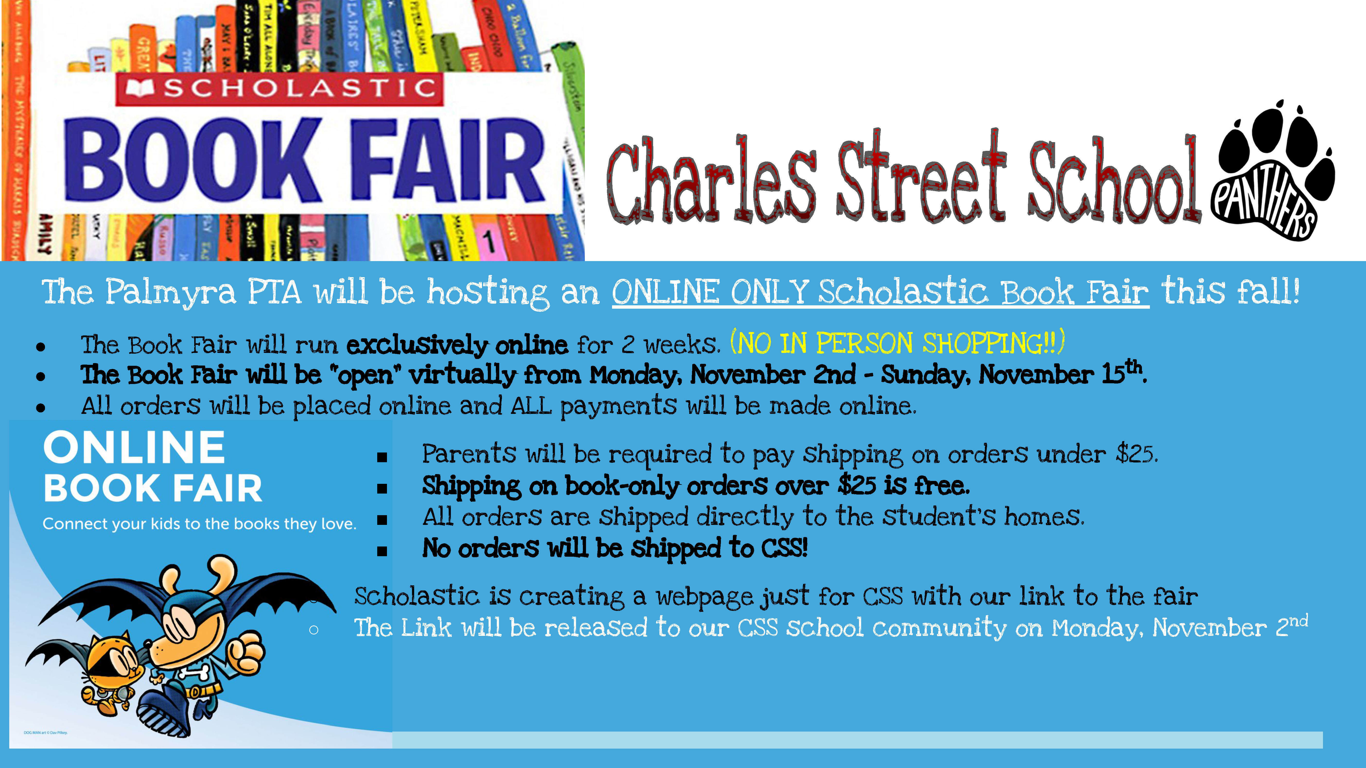 The PTA's CSS Scholastic Book Fair is open! Join your kids in exploring titles & discovering inspiring characters. The Fair will be open for shopping today through Sunday, November 15.