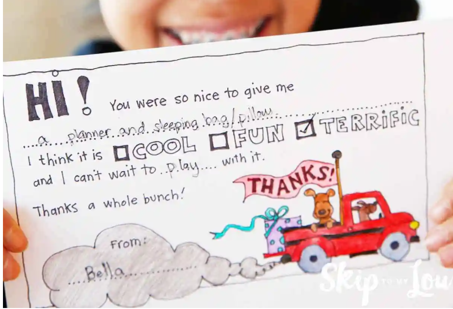 A snow day could be a PERFECT day to hand make thank you notes like the ones below & the link from the skiptomylou website includes free printables for simple notes for any age.