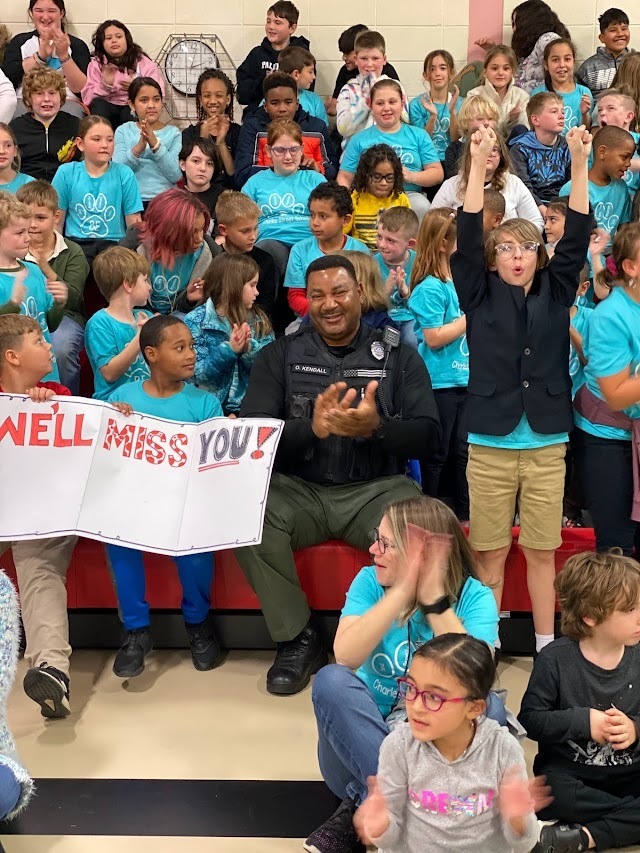 Emcee and Lead Teacher, Mr. Devlin ribbed Officer Kendall for his 250 years of service, noted that he was a Palmyra Alumni, a member of the Palmyra Athletic Hall of Fame and that he still had a chance to change his mind about retiring! He invited each class up to present Officer Kendall with their class gift and reminded the students that Officer Kendall was always one to uphold the Panther Pledge and #BeKind #BeSafe #BeResponsible & #BeRespectful.